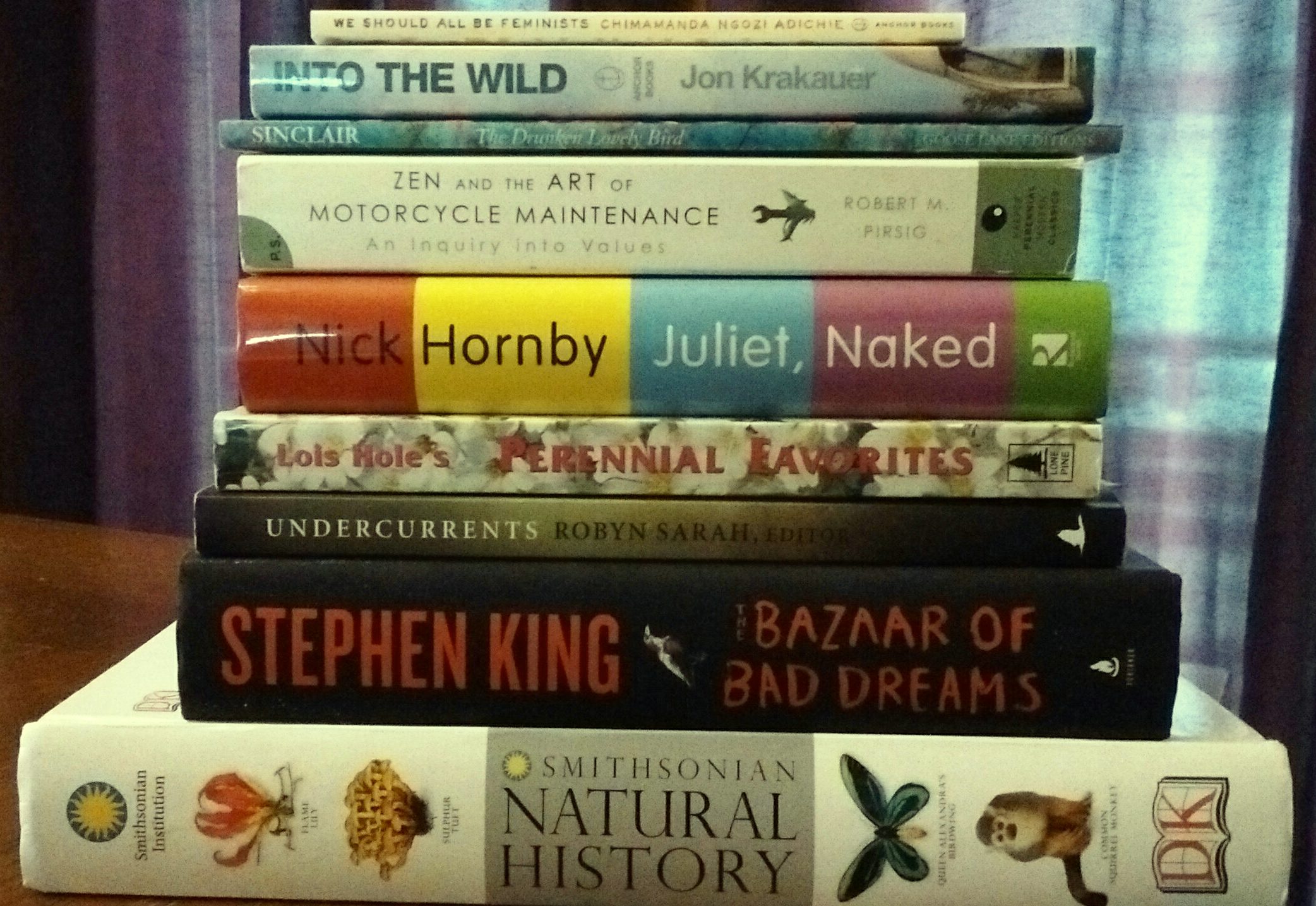 Apologies for the rush job today, but Sundays are one of the busiest days around our place. I tried to cut corners by combining prompts again: the Poetic Asides “emotion” title poem with the NaPoWriMo “book spine” poem. I asked my daughter to help me choose a few books and then build me a tower. I think I lucked out with her picks: